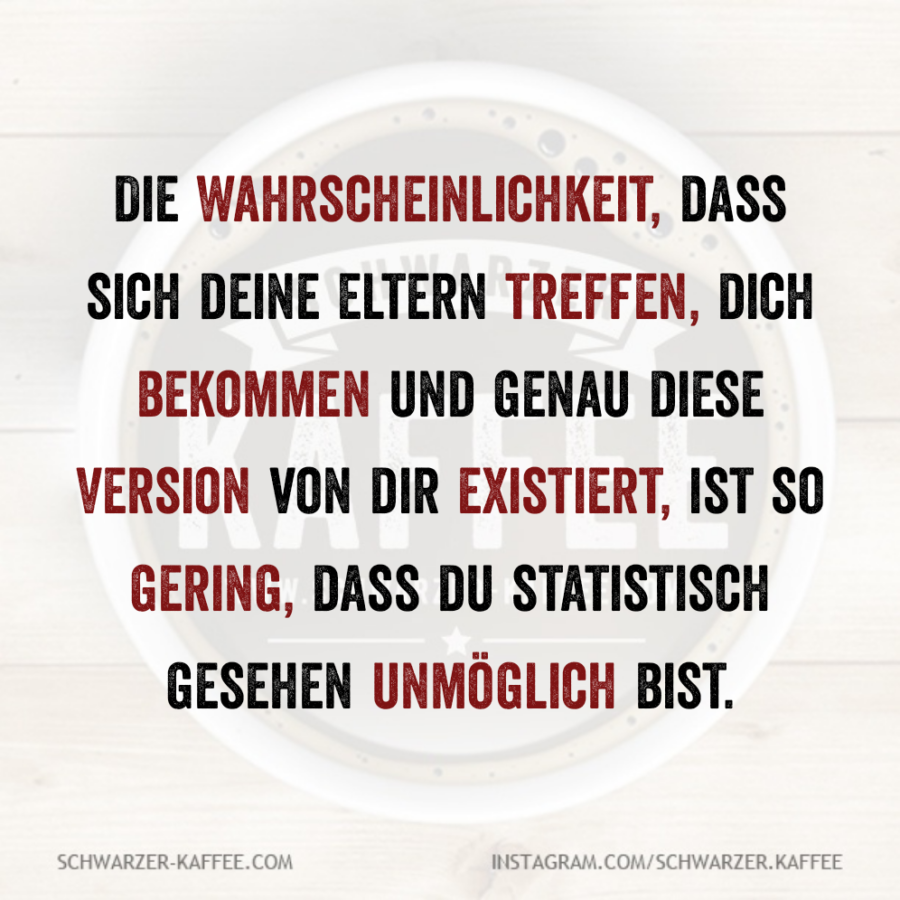 Die Wahrscheinlichkeit, dass sich deine Eltern treffen, dich bekommen und genau diese Version von dir existiert, ist so gering, dass du statistisch gesehen unmöglich bist.