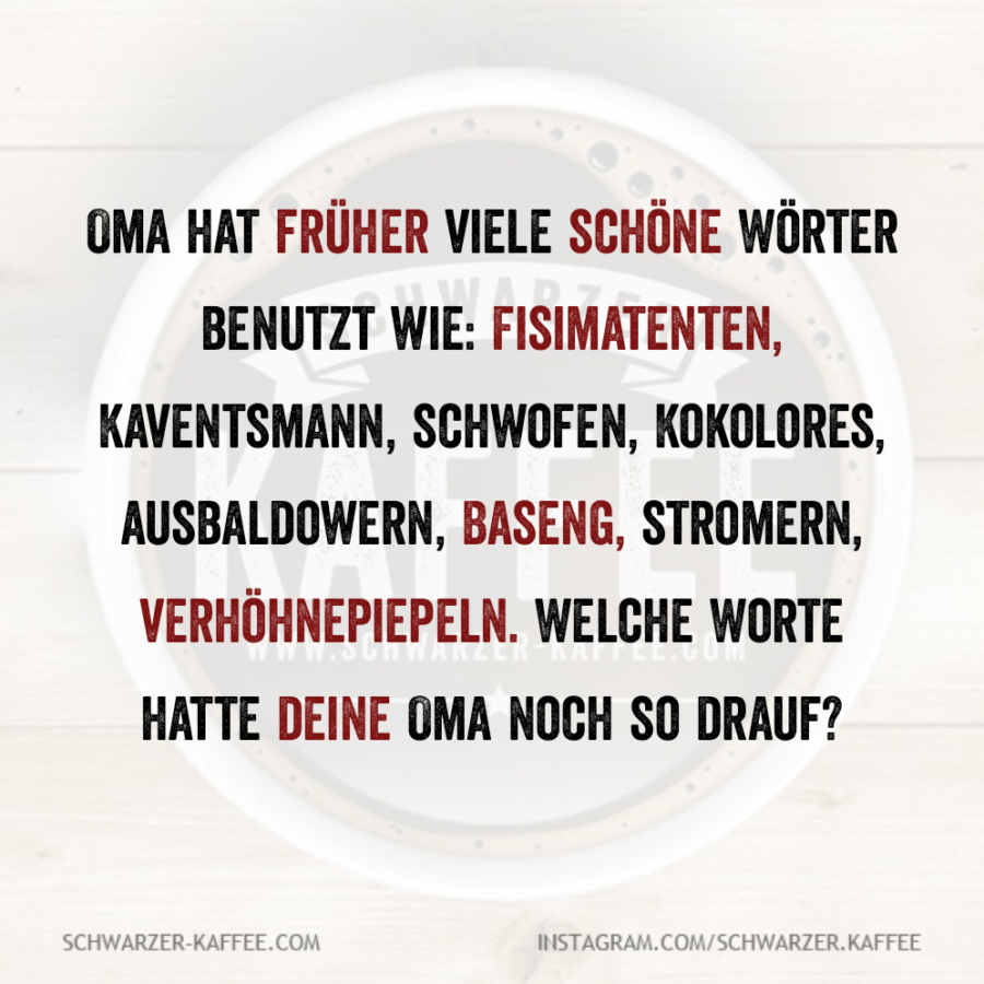 Oma hat früher viele schöne Wörter benutzt wie: Fisimatenten, Kaventsmann, schwofen, Kokolores, ausbaldowern, Baseng, stromern, verhöhnepiepeln. Welche Worte hatte deine Oma noch so drauf?