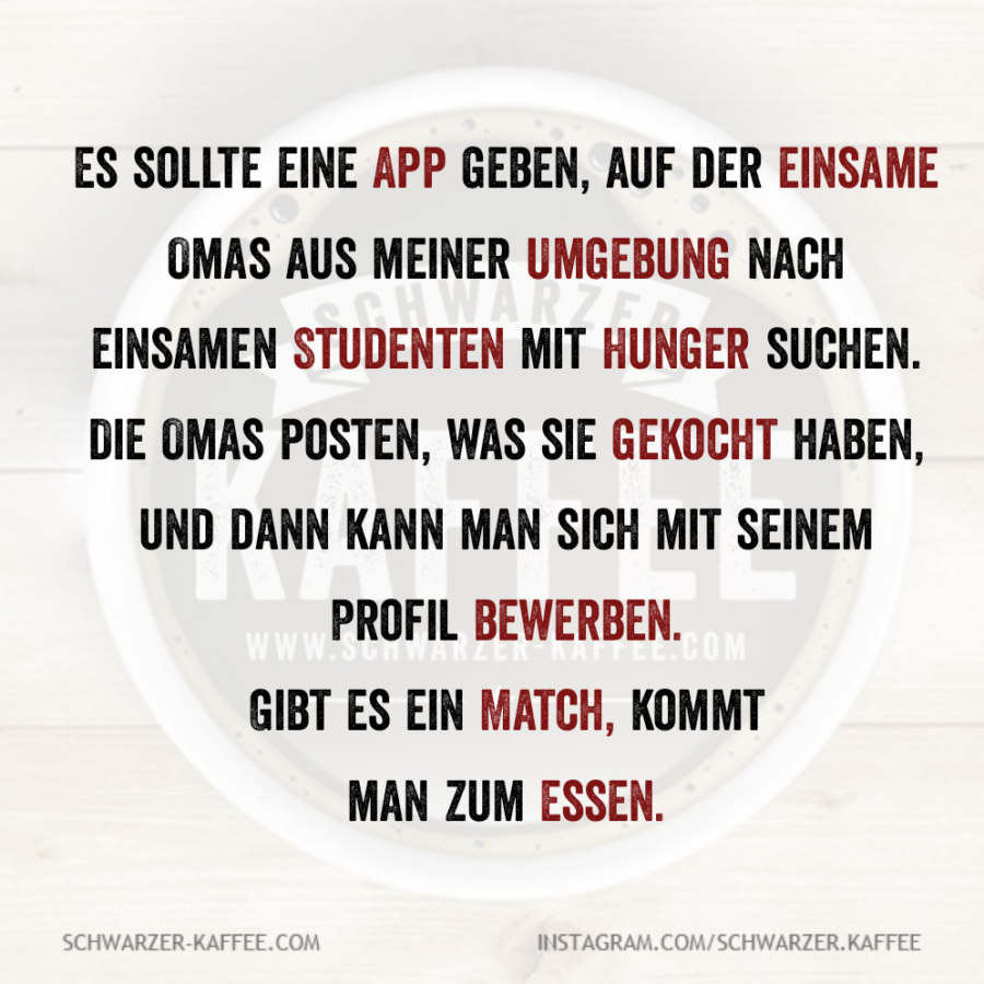 Es sollte eine App geben, auf der einsame Omas aus meiner Umgebung nach einsamen Studenten mit Hunger suchen.