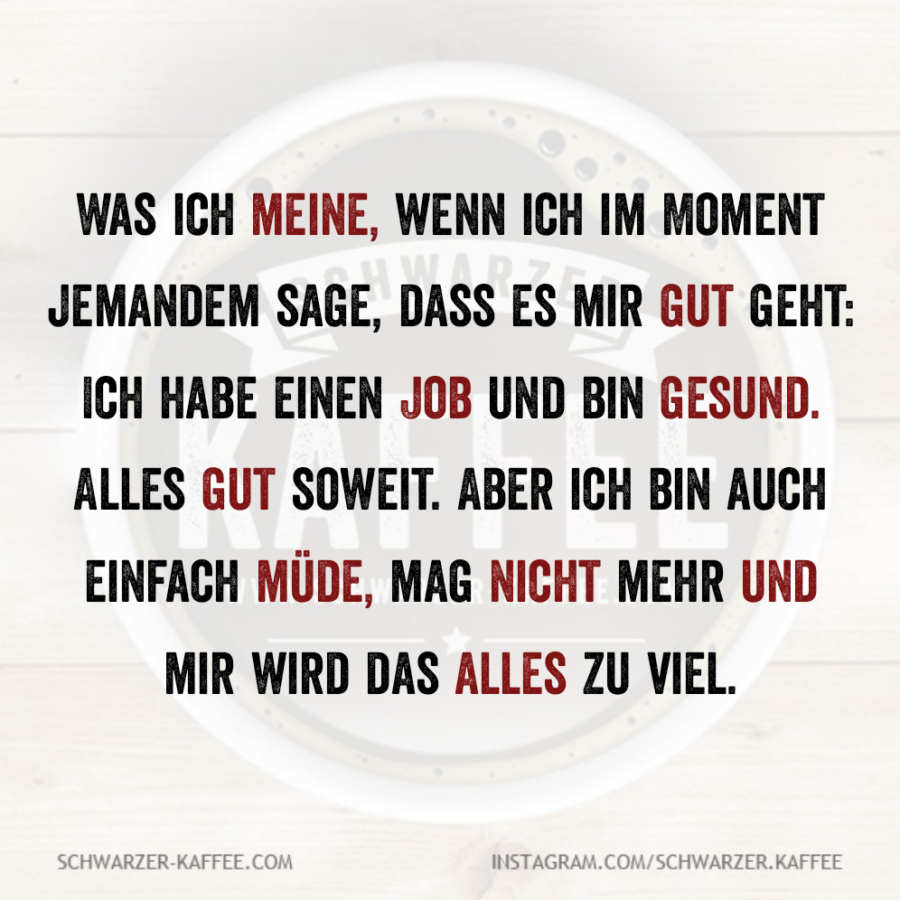 Was ich meine, wenn ich im Moment jemandem sage, dass es mir gut geht: Ich habe einen Job und bin gesund. Alles gut soweit. Aber ich bin auch einfach müde, mag nicht mehr und mir wird das alles zu viel.