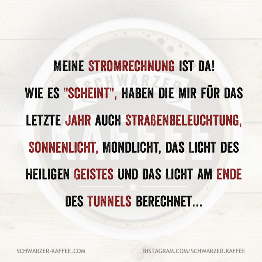Meine Stromrechnung ist da! Wie es "scheint", haben die mir für das letzte Jahr auch Straßenbeleuchtung, Sonnenlicht, Mondlicht, das Licht des Heiligen Geistes und das Licht am Ende des Tunnels berechnet…