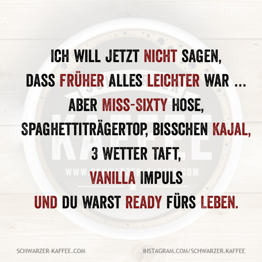 Ich will jetzt nicht sagen, dass früher alles leichter war … aber Miss-Sixty Hose, Spaghettiträgertop, bisschen Kajal, 3 Wetter Taft, Vanilla Impuls und du warst ready fürs Leben.