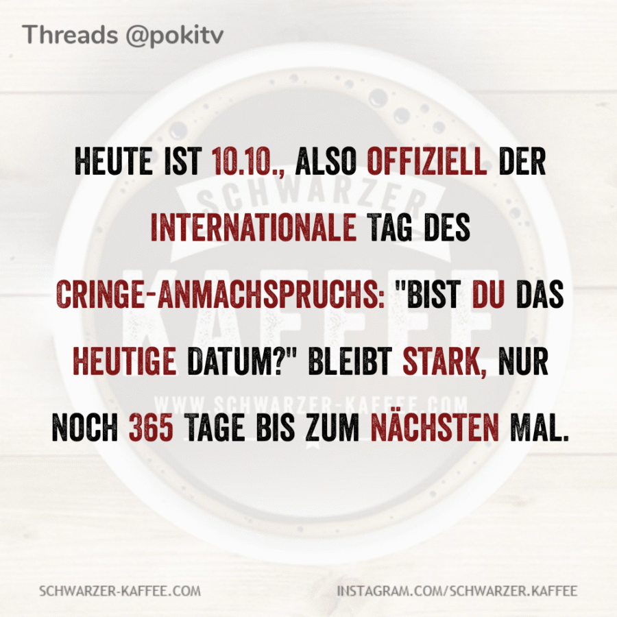 Mehmet Karakolcu2025-10-10T11:45:06+02:00 heute ist 10.10., also offiziell der internationale Tag des Cringe-Anmachspruchs: „Bist du das heutige Datum?“ Bleibt stark, nur noch 365 Tage bis zum nächsten Mal.