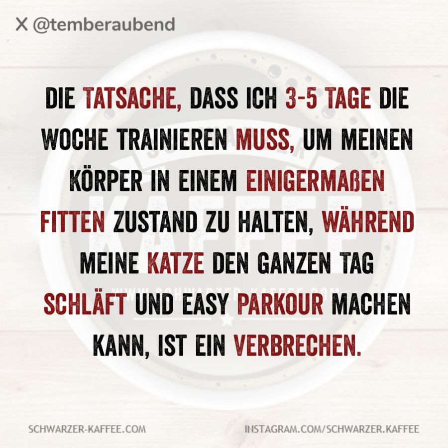 Mehmet Karakolcu2026-01-16T20:15:32+01:00 die Tatsache, dass ich 3-5 Tage die Woche trainieren muss, um meinen Körper in einem einigermaßen fitten Zustand zu halten, während meine Katze den ganzen Tag schläft und easy Parkour machen kann, ist ein Verbrechen.