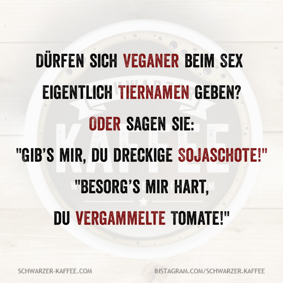 Mehmet Karakolcu2025-10-29T11:30:22+01:00 Dürfen sich Veganer beim Sex eigentlich Tiernamen geben?Oder sagen sie:„Gib’s mir, du dreckige Sojaschote!“„Besorg’s mir hart, du vergammelte Tomate!“