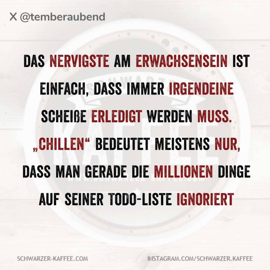 Mehmet Karakolcu2025-11-08T09:00:53+01:00 das nervigste am erwachsensein ist einfach, dass immer irgendeine scheiße erledigt werden muss. „chillen“ bedeutet meistens nur, dass man gerade die millionen dinge auf seiner ToDo-liste ignoriert