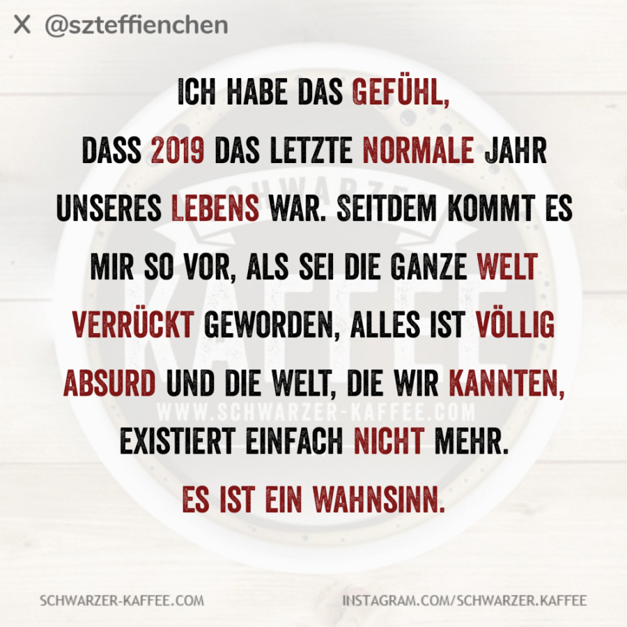 Ich habe das Gefühl, dass 2019 das letzte normale Jahr unseres Lebens war. Seitdem kommt es mir so vor, als sei die ganze Welt verrückt geworden, alles ist völlig absurd und die Welt, die wir kannten, existiert einfach nicht mehr. Es ist ein Wahnsinn.