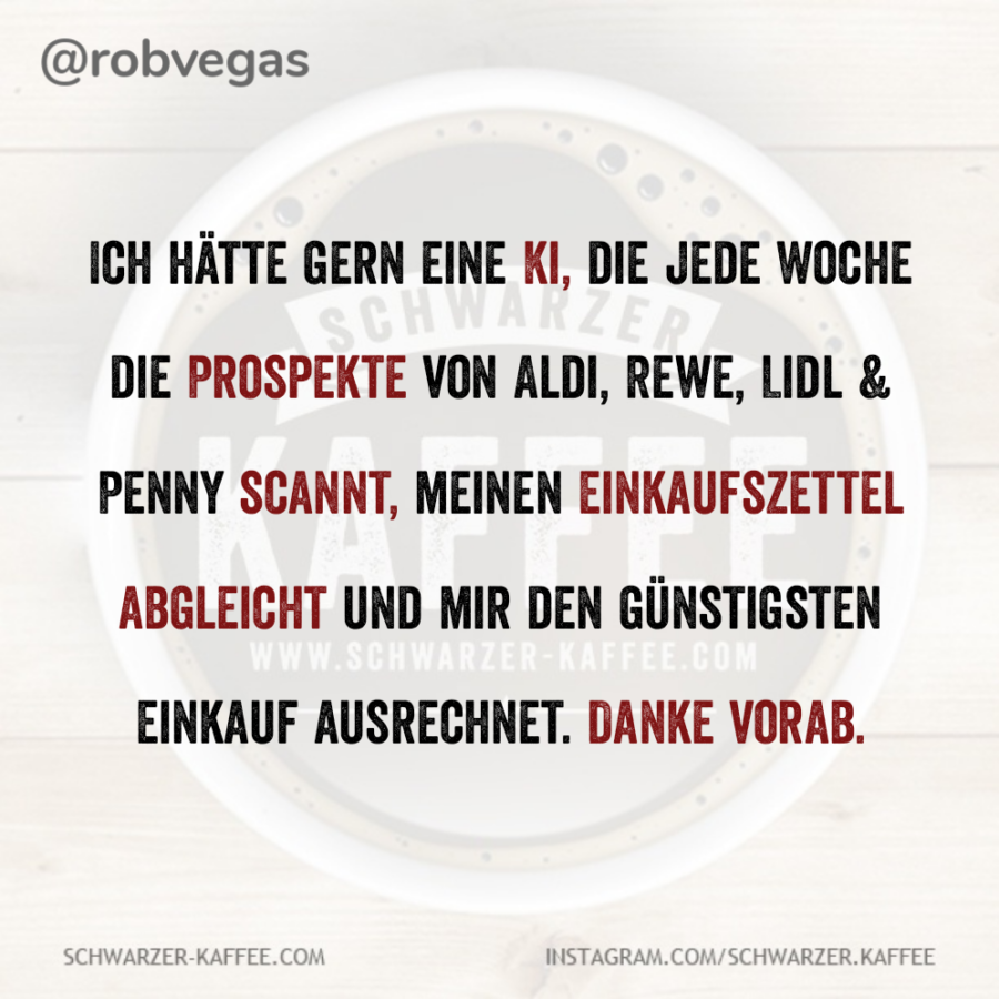 Mehmet Karakolcu2025-12-06T11:19:44+01:00 Ich hätte gern eine Ki, die jede Woche die Prospekte von Aldi, Rewe, Lidl & Penny scannt, meinen Einkaufszettel abgleicht und mir den günstigsten Einkauf ausrechnet. Danke vorab.
