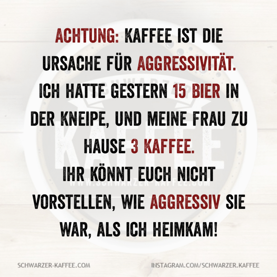 Mehmet Karakolcu2025-11-22T07:00:23+01:00 Achtung: Kaffee ist die Ursache für Aggressivität. Ich hatte gestern 15 Bier in der Kneipe, und meine Frau zu Hause 3 Kaffee. Ihr könnt euch nicht vorstellen, wie aggressiv sie war, als ich heimkam!