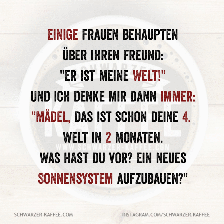 Mehmet Karakolcu2025-11-04T14:00:48+01:00 Einige Frauen behaupten über ihren Freund:„Er ist meine Welt!“Und ich denke mir dann immer:„Mädel, das ist schon deine 4. Welt in 2 Monaten.Was hast du vor? Ein neues Sonnensystem aufzubauen?“