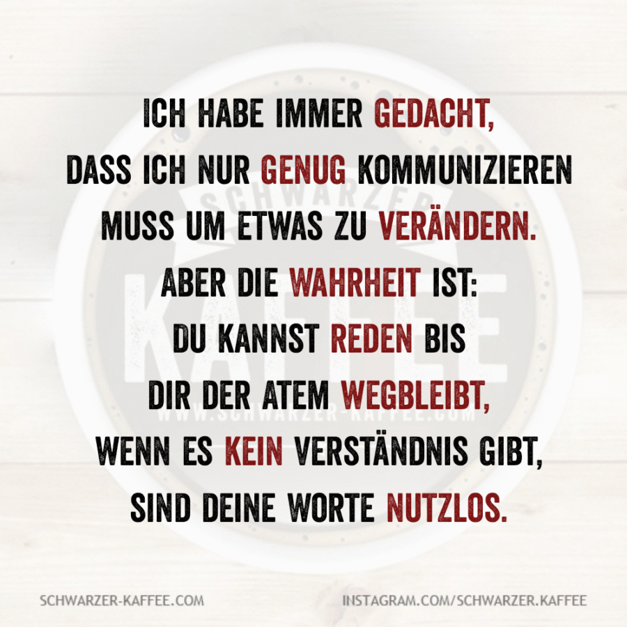 Ich habe immer gedacht, dass ich nur genug kommunizieren muss um etwas zu verändern. Aber die Wahrheit ist: Du kannst reden bis dir der Atem wegbleibt, wenn es kein Verständnis gibt, sind deine Worte nutzlos.