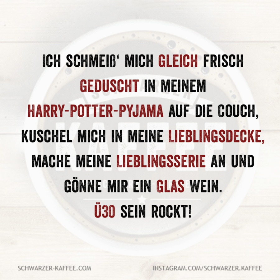 Ich schmeiß‘ mich gleich frisch geduscht in meinem Harry-Potter-Pyjama auf die Couch, kuschel mich in meine Lieblingsdecke, mache meine Lieblingsserie an und gönne mir ein Glas Wein.