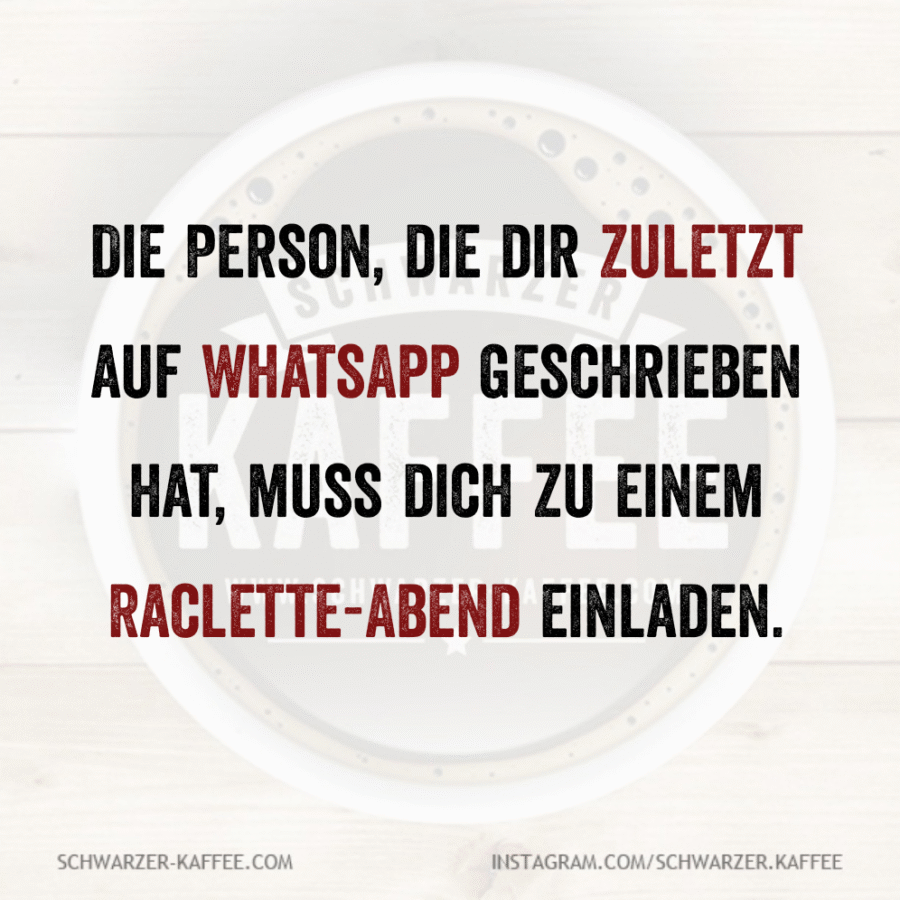 Mehmet Karakolcu2025-10-18T20:00:57+02:00 Die Person, die dir zuletzt auf WhatsApp geschrieben hat, muss dich zu einem Raclette-Abend einladen.
