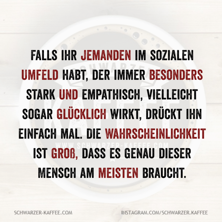 Mehmet Karakolcu2025-11-06T21:41:14+01:00 Falls ihr jemanden im sozialen Umfeld habt, der immer besonders stark und empathisch, vielleicht sogar glücklich wirkt, drückt ihn einfach mal. Die Wahrscheinlichkeit ist groß, dass es genau dieser Mensch am meisten braucht.
