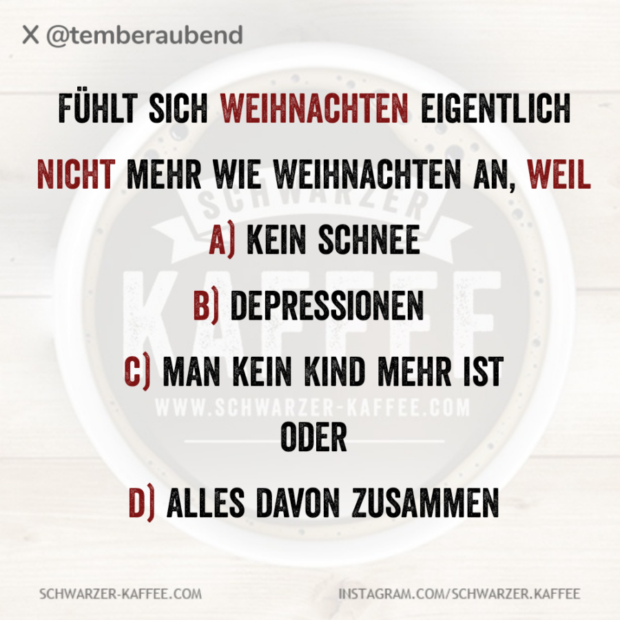 Mehmet Karakolcu2025-12-26T11:39:47+01:00 Fühlt sich Weihnachten eigentlich nicht mehr wie Weihnachten an, weil a) kein schnee b) depressionen c) man kein Kind mehr ist oder d) alles davon zusammen