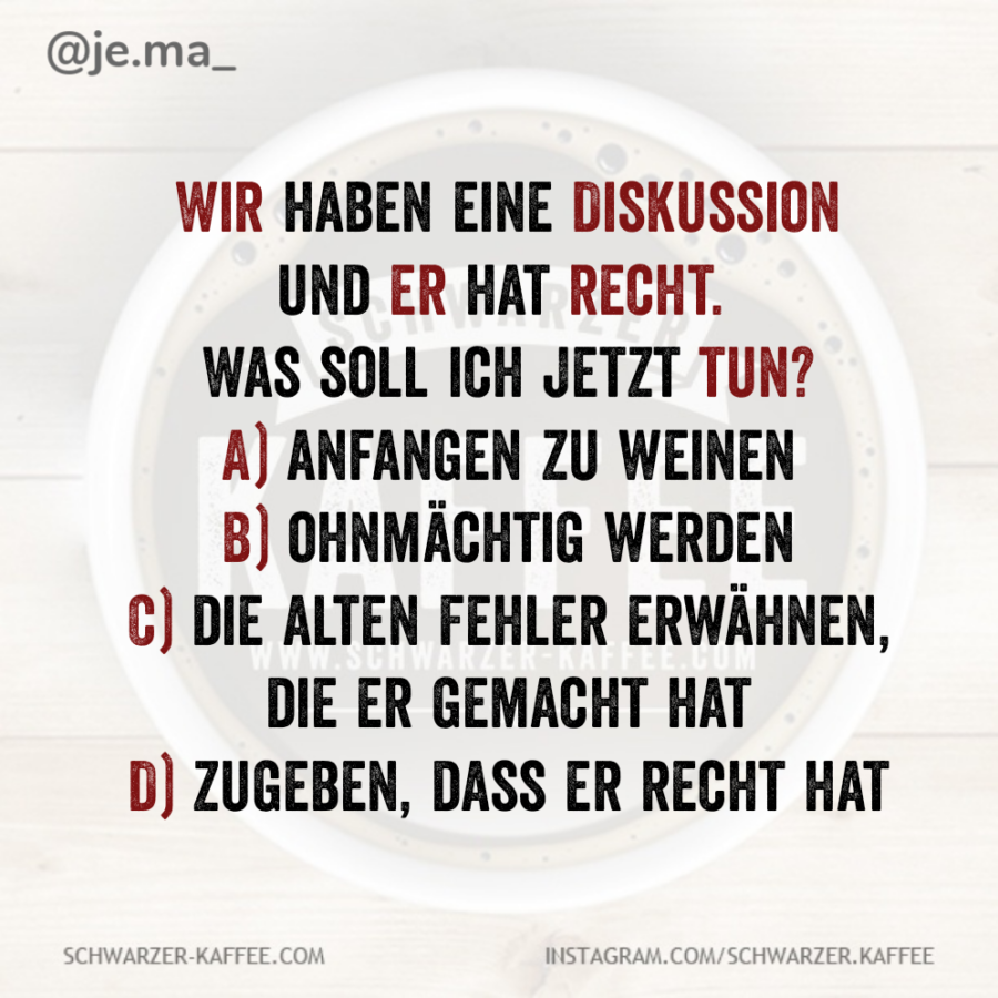 Mehmet Karakolcu2026-01-08T08:50:53+01:00 Wir haben eine Diskussion und er hat recht. Was soll ich jetzt tun? A) anfangen zu weinen B) ohnmächtig werden C) die alten Fehler erwähnen, die er gemacht hat D) zugeben, dass er recht hat